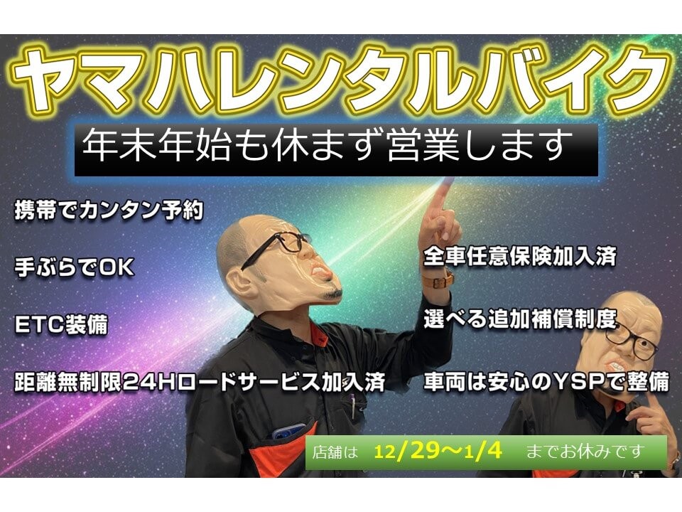 YSP豊川では年末年始もレンタルバイクは休まず営業します!レンタル当日が「×」になっていても連絡してみてください。当店が冬季休暇中でもレンタルバイクをご希望の方 当番の三浦のケイタイ(090-3250-8808)までご連絡ください。できる範囲全力で対応します!(注意:12/29月曜はレンタルバイクお休みさせていただきます)