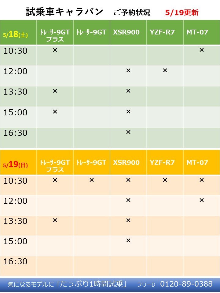 試乗予約(フリーD 0120-89-0388) 1車種につき2日間で10名です。TELにてご予約の際、希望機種と日時をご連絡ください。 空き情報は随時当店HPにて、また当日空きがある場合は受付します。
