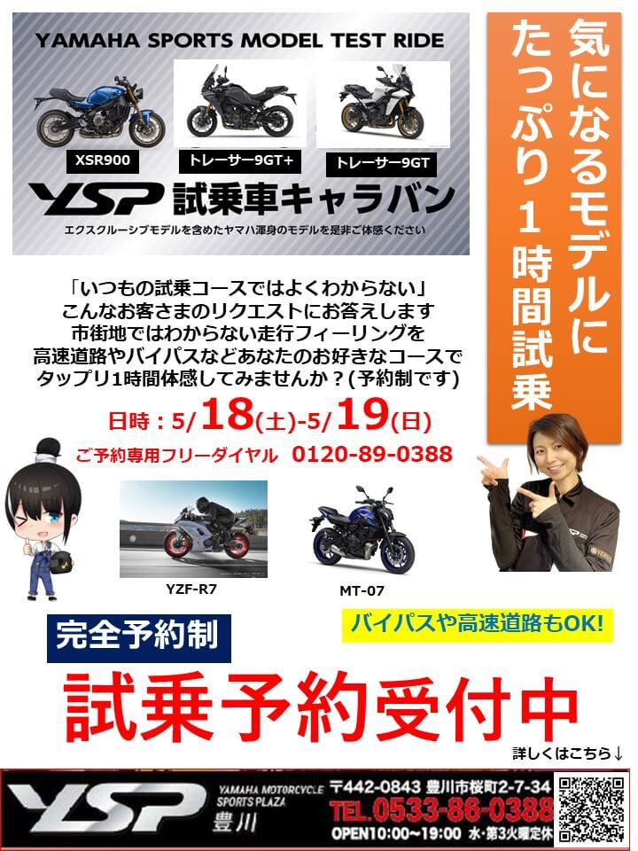 試乗機種は トレーサー9GTプラス・トレーサー9GT・XSR900・YZF-R7・MT-07 気になるモデルにおひとりさまたっぷり1時間試乗できますよ!「いつもの試乗コースでは体感できない」こんなお客さまのリクエストにお答えします。市街地の試乗だけではわからない走行フィーリングを23号バイパス等で前方からの風圧や横風の影響なども体感してみてください。まずは空き情報をTELにて確認!(フリーD 0120-89-0388)