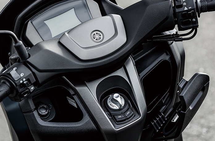 フューエルタンク容量も6.6L→7.1Lへ拡大、左フロントポケットは600mlのペットボトルが入り、右はリッド付フロントボックス、シート下もヘルメット+レインウエアーなど収納可能(一部突起あるヘルメットはNG)、12VシガーDCジャックやヘルメットホルダーも2個装備、もちろんスマートキーでポケットに入れてるだけでエンジン始動やハンドルロックもワンタッチです