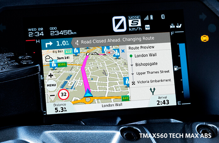 7インチカラーTFTメーターはスマートフォンと連携しナビゲーション画面とメーターパネルに切り替えもでき 見知らぬツーリング先でも快適にサポートします。もちろん着信やメール受信、現在地周辺の天気、音楽再生など、スマートフォンの情報を車両のメーターに表示 複雑になりがちなジョイスティックの操作がゲーム感覚でわかりやすい